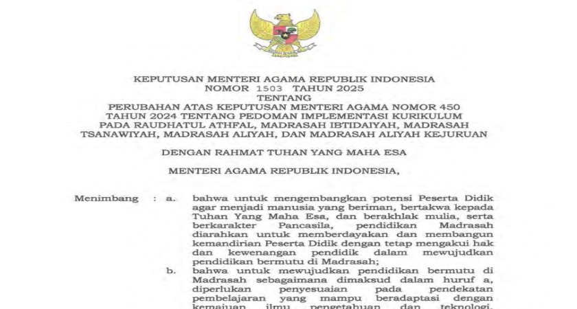 Kementerian Agama Republik Indonesia merilis Keputusan Menteri Agama (KMA) Nomor 1503 Tahun 2025 tentang Perubahan atas KMA Nomor 450 Tahun 2024.