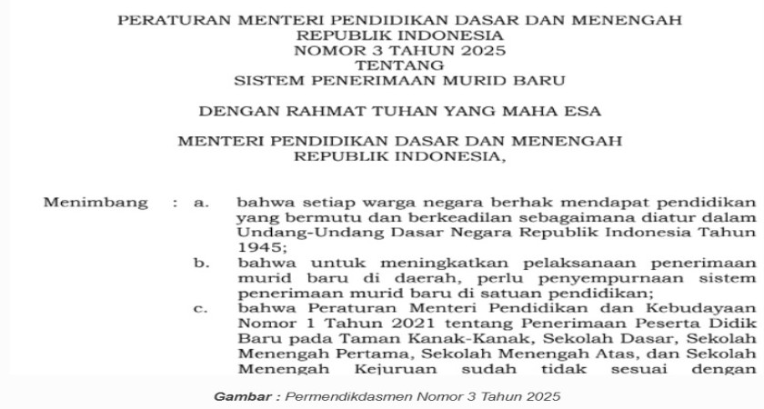 Permendikdasmen Nomor 3 Tahun 2025 tentang Sistem Penerimaan Murid Baru