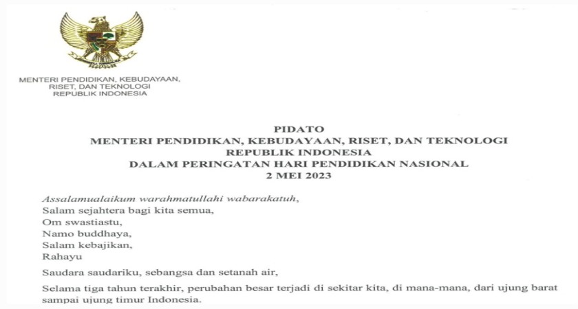 Teks Pidato Mendikbudristek dalam Peringatan Hari Pendidikan Nasional Tahun 2023