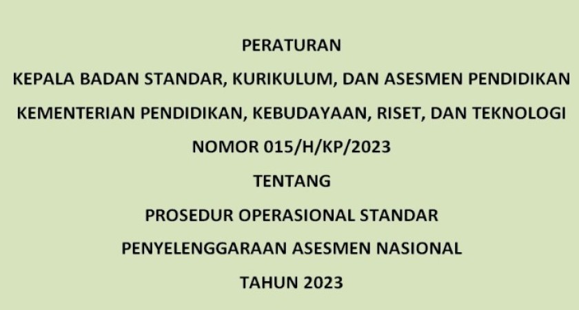 Kementerian Pendidikan dan Kebudayaan telah menerbtikan Jadwal dan POS ANBK tahun 2023 melalui Peraturan Kepala Badan Standar, Kurikulum, Dan Asesmen Pendidikan Kementerian Pendidikan, Kebudayaan, Riset, Dan Teknologi Nomor 015/H/KP/2023 Tentang Prosedur Operasional Standar Penyelenggaraan Asesmen Nasional Tahun 2023.