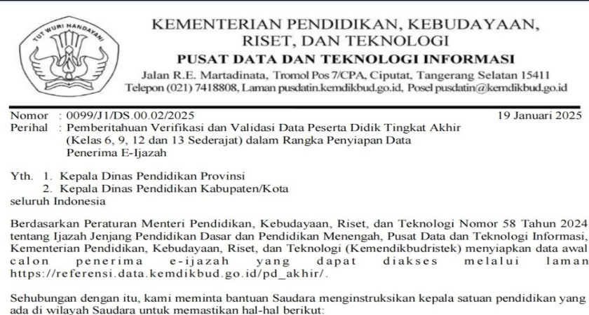 Kementerian Pendidikan, Kebudayaan, Riset, dan Teknologi (Kemendikbudristek) melalui Pusat Data dan Teknologi Informasi telah mengeluarkan surat pemberitahuan terkait verifikasi dan validasi data peserta didik tingkat akhir dalam rangka penyiapan data penerima E-Ijazah tahun 2025. Surat dengan nomor 0099/J1/DS.00.02/2025 ini ditujukan kepada Kepala Dinas Pendidikan Provinsi serta Kepala Dinas Pendidikan Kabupaten/Kota di seluruh Indonesia.